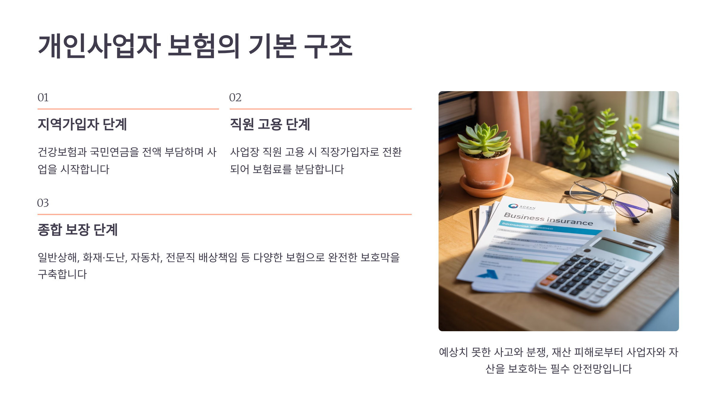 개인사업자 보험은 크게 재산보험, 배상책임보험, 그리고 인보험으로 구분되어 있어요. 재산보험은 사업장의 건물, 시설, 재고자산 등을 보호하고, 배상책임보험은 제3자에게 발생한 손해를 보상해주며, 인보험은 사업주와 직원의 상해나 질병을 보장한답니다. 이 세 가지가 유기적으로 연결되어 사업 전반의 위험을 관리하는 구조예요.