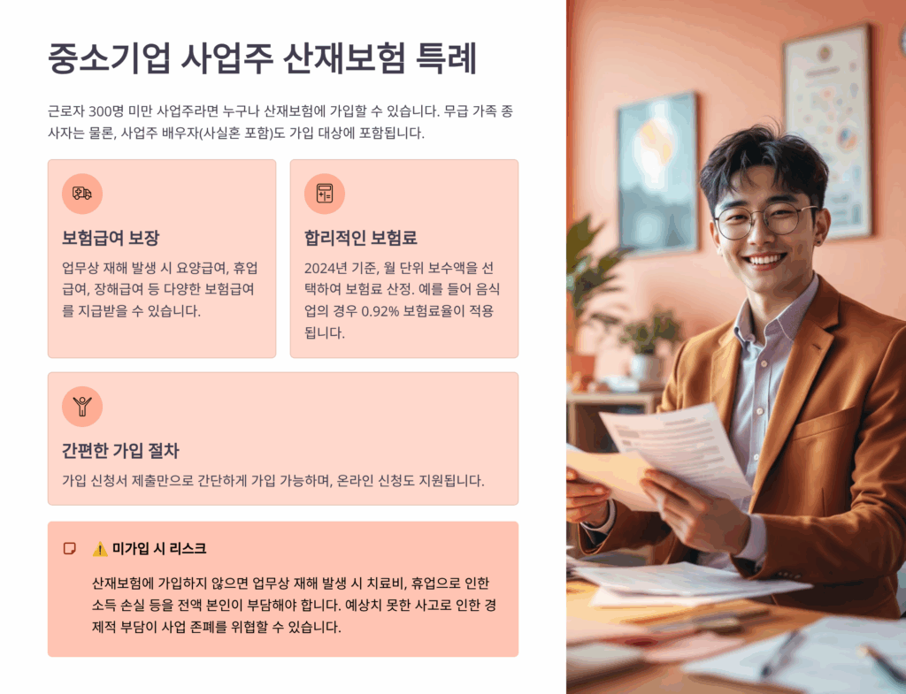 개인사업자나 중소기업 사업주가 산재보험에 가입하지 않으면 정말 큰 손해를 볼 수 있어요. 업무 중 사고가 발생했을 때 치료비부터 휴업급여까지 모든 비용을 본인이 부담해야 하거든요. 특히 2025년부터는 더 많은 혜택이 추가되어서 가입하지 않으면 아까운 상황이에요.