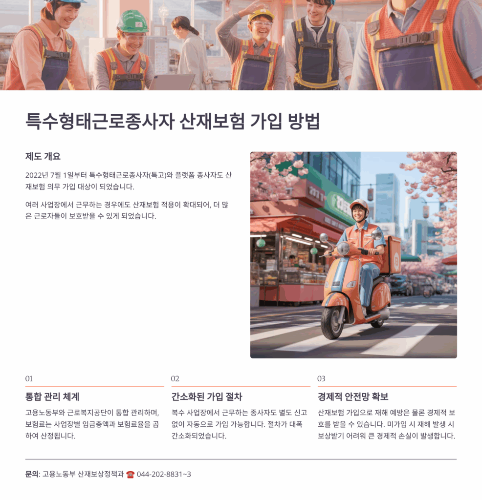 특수형태근로종사자, 줄여서 특고라고 부르는 분들도 이제는 산재보험 가입이 가능해요! 보험설계사, 학습지 교사, 택배기사, 대리운전기사, 배달라이더 등 14개 직종이 대상이에요. 2025년부터는 플랫폼 노동자까지 확대되어서 더 많은 분들이 보호받을 수 있게 되었답니다.