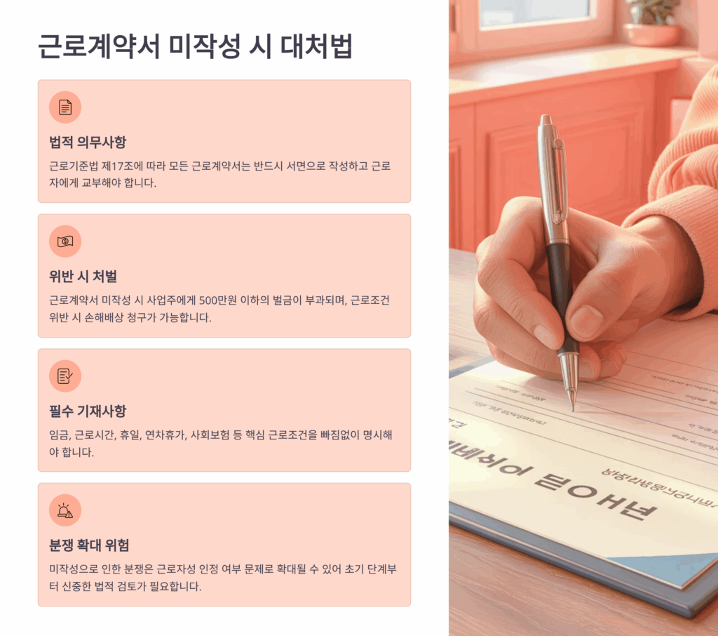 근로계약서를 작성하지 않았다고 해서 근로관계가 성립하지 않는 건 아니에요. 실제로 일을 시작했다면 묵시적 근로계약이 체결된 것으로 봐요. 근로기준법 제17조에 따르면 사용자는 근로계약 체결시 임금, 근로시간, 휴일, 휴가 등 주요 근로조건을 서면으로 명시해야 하는데요. 이를 위반하면 500만원 이하의 벌금에 처해질 수 있어요.