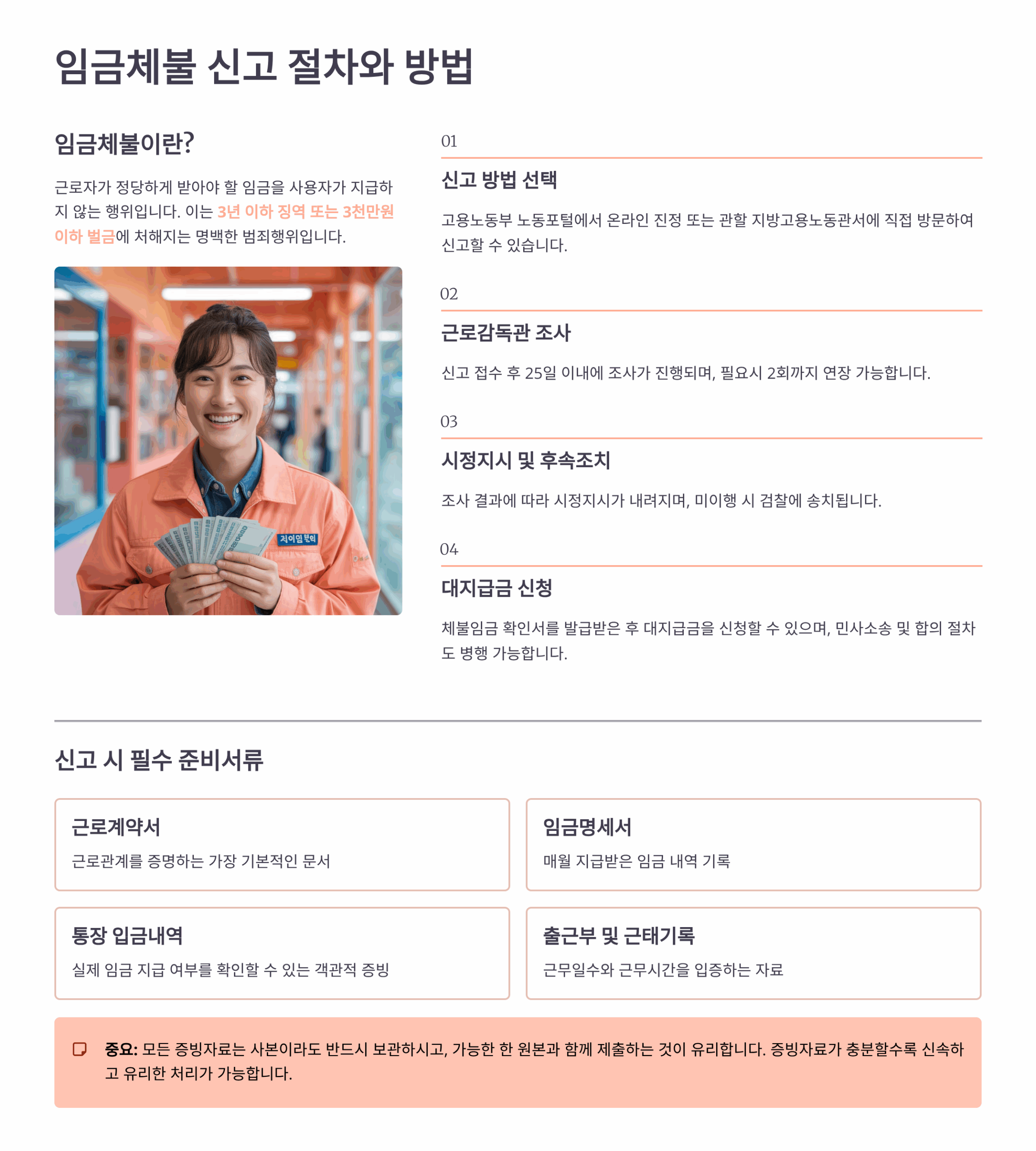 임금체불 신고는 크게 두 가지 방법이 있어요. 첫 번째는 고용노동부에 진정을 제기하는 방법이고, 두 번째는 검찰에 직접 고소하는 방법이에요. 대부분은 노동부 진정을 먼저 하는데, 이유는 절차가 간단하고 비용이 들지 않기 때문이에요. 온라인으로도 신고가 가능하고, 근로감독관이 직접 조사해서 체불임금을 받아주려고 노력해요.