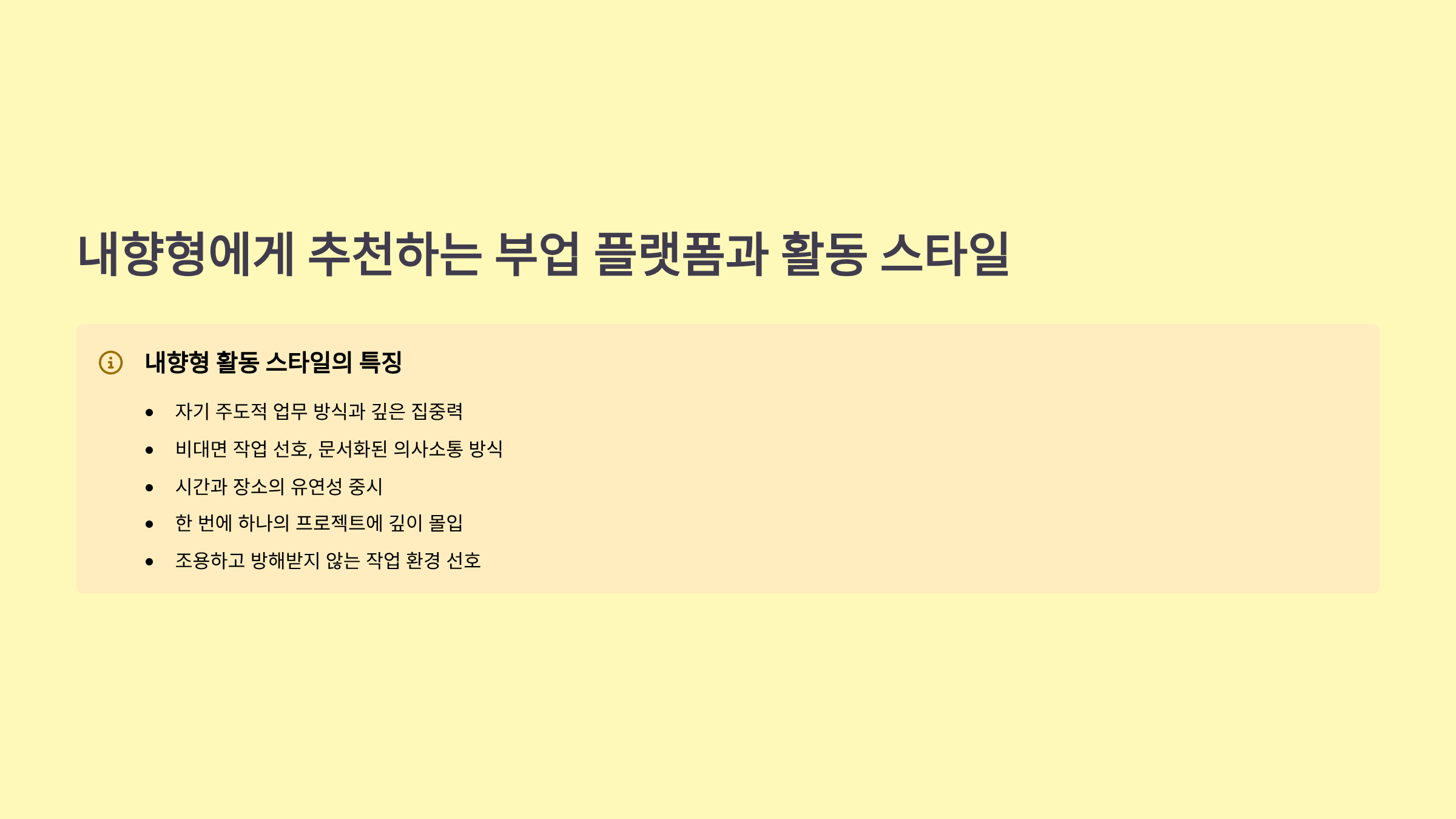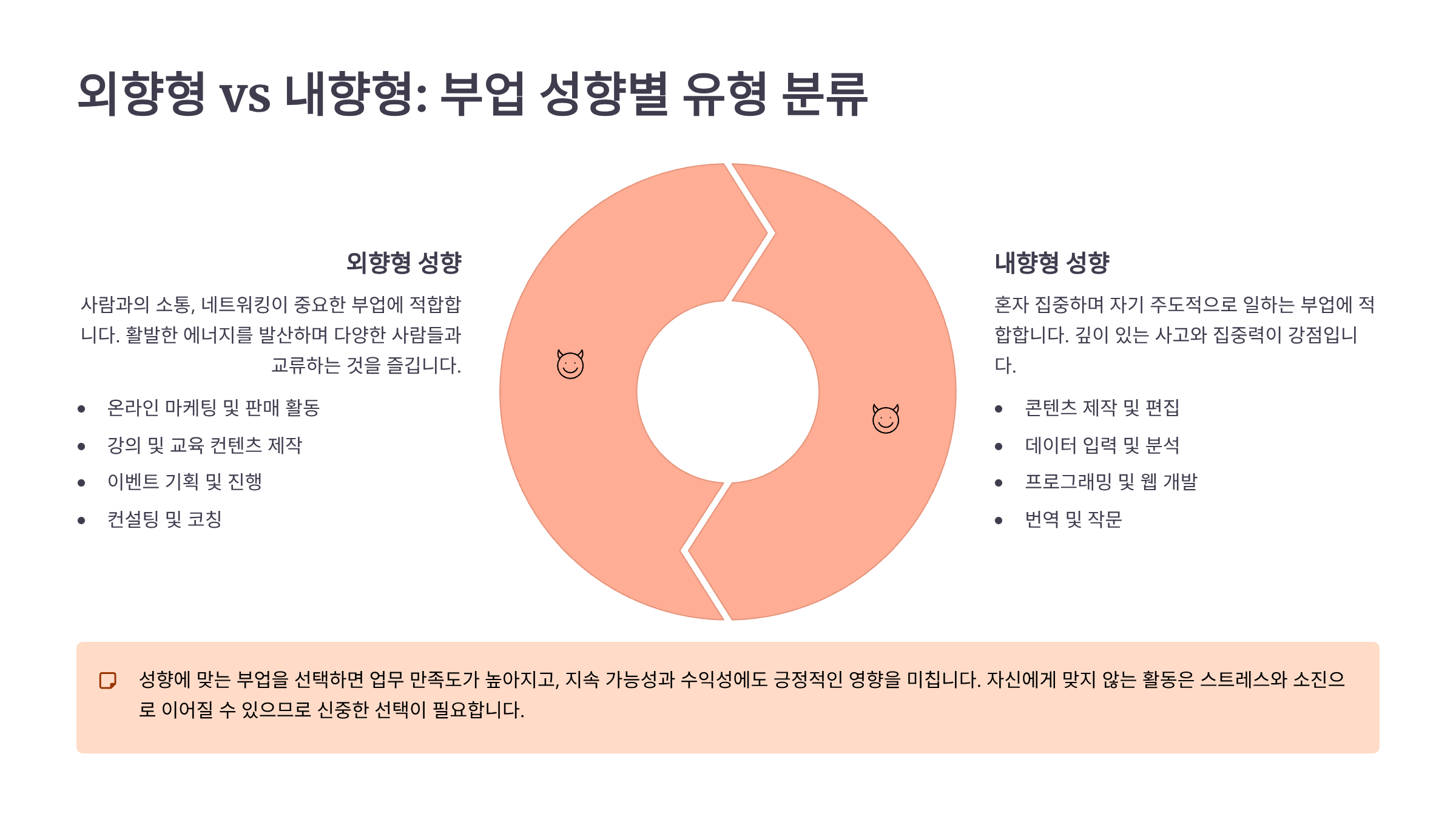 반면 내향형은 혼자 집중해서 작업하는 부업이 적합해요. 글쓰기, 번역, 코딩, 온라인 강의 제작 같은 일들이죠. 브런치 작가, 클래스101 강사, 인프런 강의 제작 같은 활동을 추천해요. 이런 일들은 깊이 있는 사고와 꼼꼼함이 필요한데, 내향형의 강점과 정확히 맞아떨어진답니다.