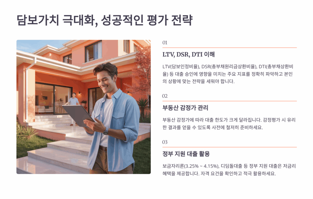 담보가치를 최대한 높게 평가받는 것은 대출한도와 금리에 직접적인 영향을 미치는 핵심 요소예요. 감정평가액이 높을수록 LTV(주택담보대출비율) 한도 내에서 더 많은 금액을 대출받을 수 있고, 금리도 유리해져요. 첫 번째 전략은 ‘감정평가 시점 조절’인데, 부동산 시장이 상승기일 때 평가받으면 더 높은 가치를 인정받을 수 있어요.