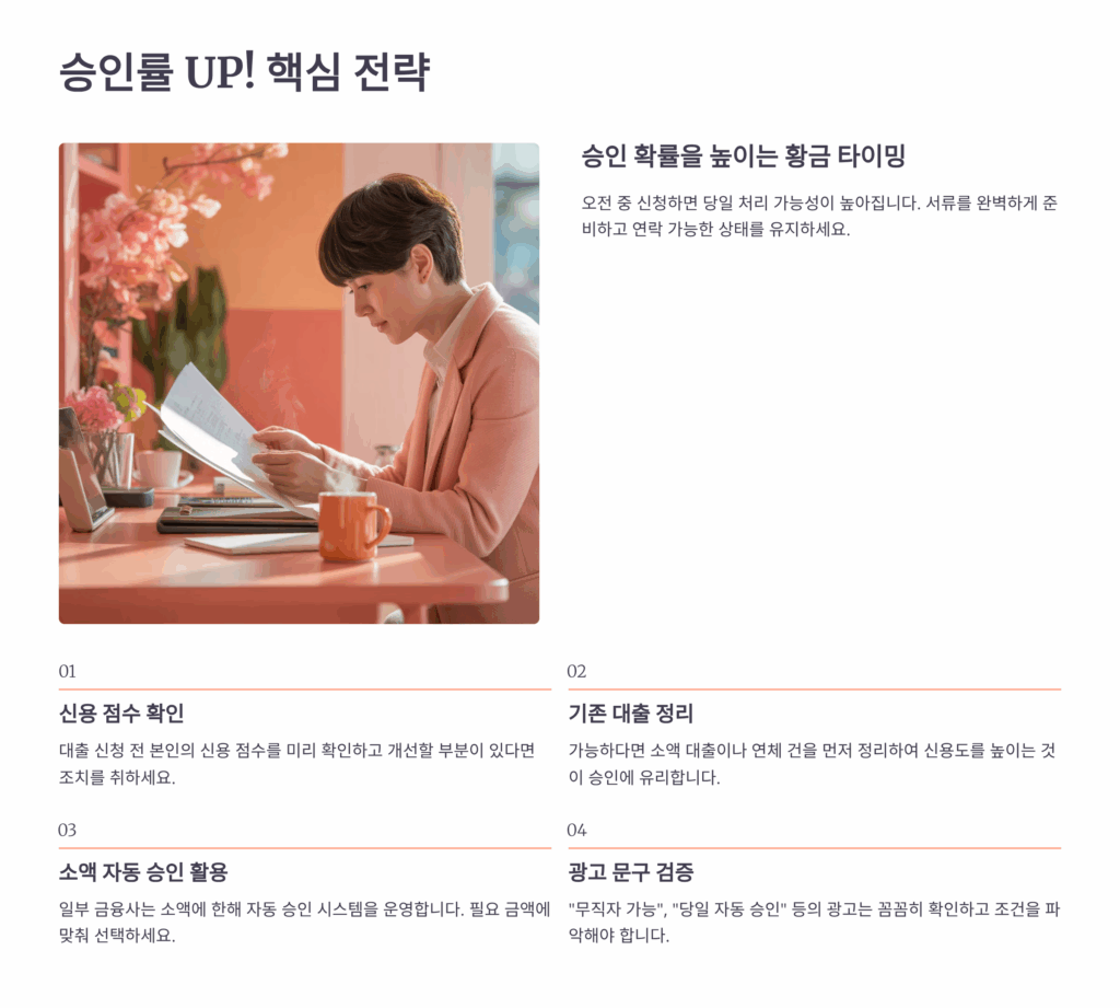 부업자금을 당일 승인받기 위해서는 철저한 사전 준비와 전략적인 접근이 필요해요. 가장 중요한 것은 본인의 신용 상태를 정확히 파악하고, 그에 맞는 금융 상품을 선택하는 거예요. 신용등급이 높을수록 승인 가능성이 높아지고, 금리도 유리하게 적용받을 수 있답니다.