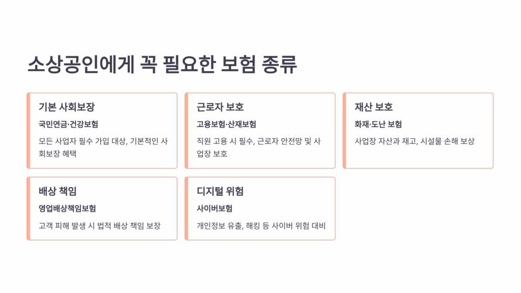 소상공인이 반드시 가입해야 할 보험은 크게 5가지로 나뉘어요. 업종별로 필요한 보험이 다르지만, 기본적으로 재산보험과 배상책임보험은 필수예요. 각 보험의 특징과 보장 내용을 자세히 알아볼게요.