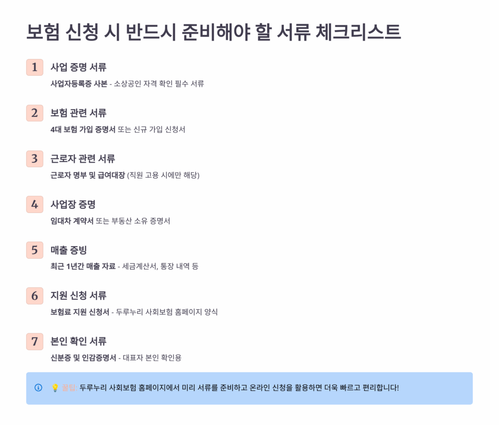 정부 지원 보험에 가입하려면 추가 서류가 필요해요. 소상공인 확인서는 소상공인시장진흥공단 홈페이지에서 무료로 발급받을 수 있어요. 지자체 지원을 받으려면 주민등록등본과 지방세 완납증명서도 필요하답니다.