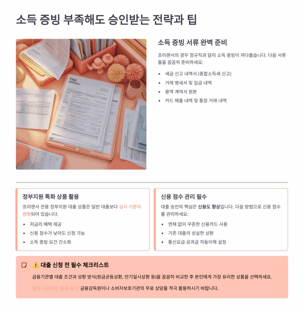 넷째, 1금융권에서 거절당했다고 포기하지 말고 2금융권, 정부지원상품 순으로 접근하세요. 다섯째, 가능하다면 신뢰할 수 있는 대출 중개 전문가의 도움을 받으세요. 여섯째, 서류는 완벽하게 준비하고 상환 계획서를 구체적으로 작성하세요.