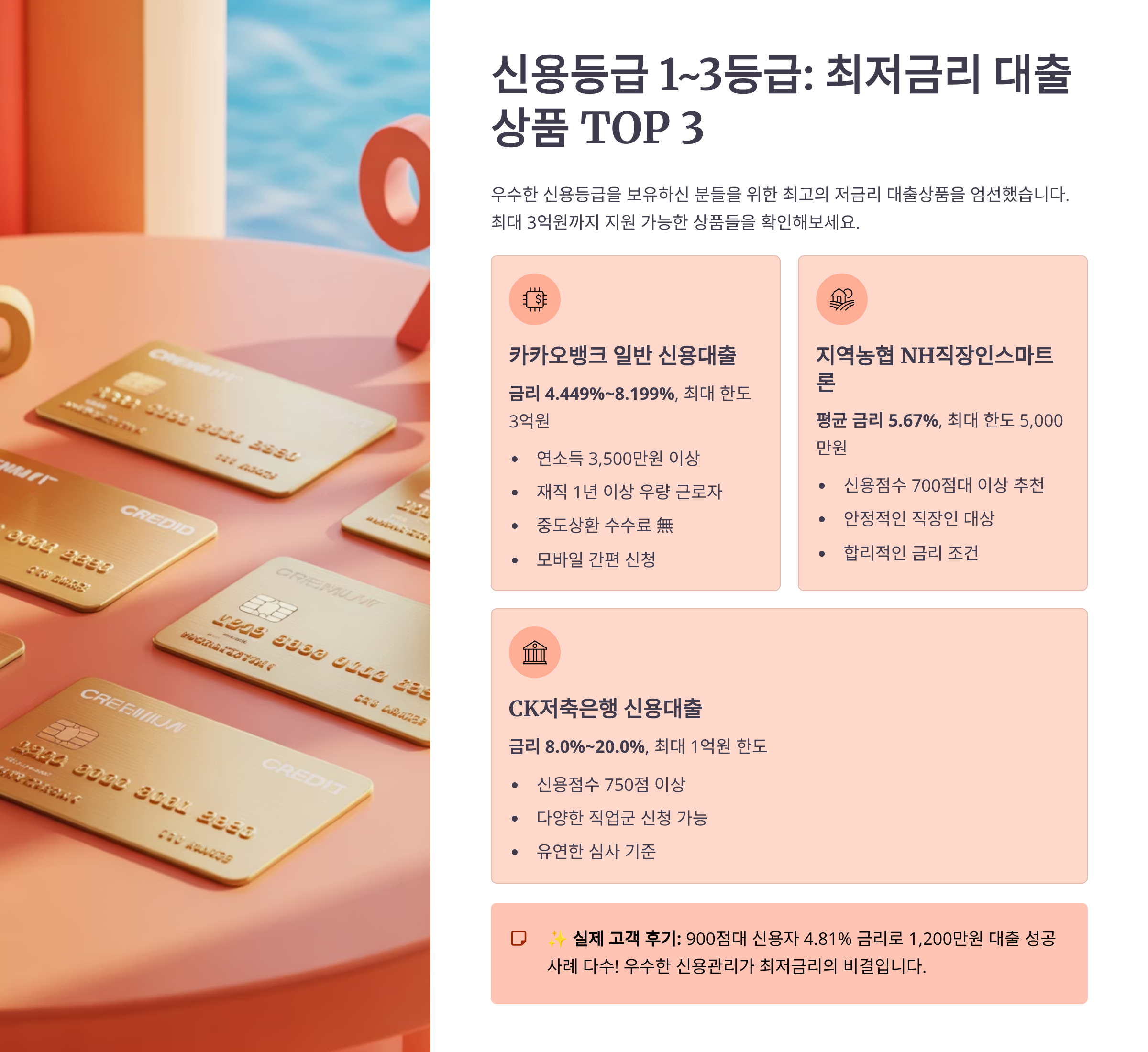 신용등급 1-3등급이신 분들은 금융권에서 우량 고객으로 분류되어 가장 좋은 조건의 대출을 받을 수 있어요. 2025년 10월 기준으로 주요 시중은행들의 최저금리는 연 3.5%부터 시작하며, 우대조건을 모두 충족하면 3%대 초반까지도 가능해요.