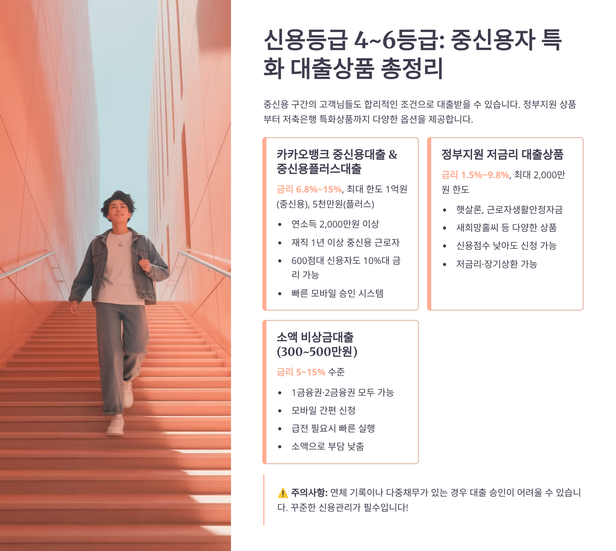 신용등급 4-6등급 중신용자분들은 최근 금융당국의 중금리 대출 활성화 정책 덕분에 선택의 폭이 넓어졌어요. 2025년 현재 중신용자 전용 상품들이 대폭 늘어나면서 연 6-11% 대의 합리적인 금리로 자금을 조달할 수 있게 되었답니다.