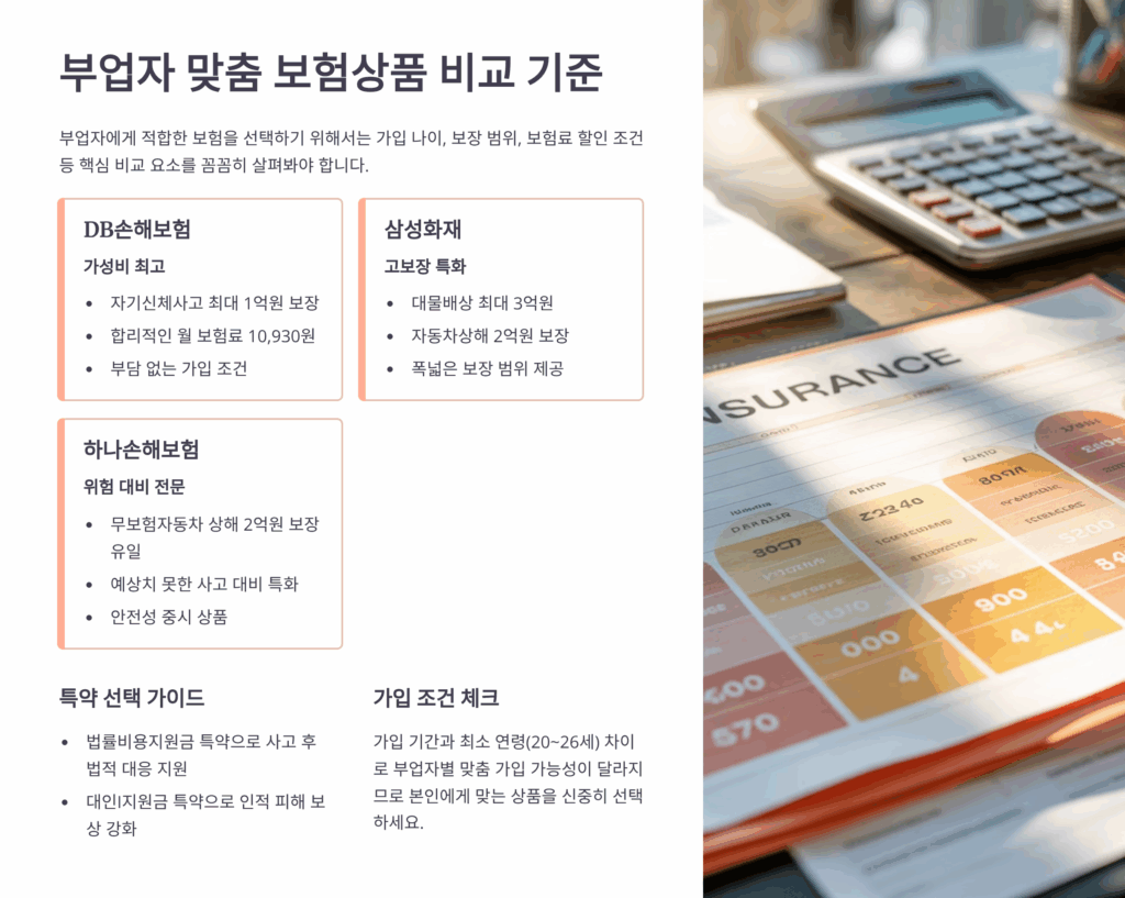 보험상품을 비교할 때는 먼저 자신의 부업 형태를 명확히 파악해야 해요. 프리랜서형 부업인지, 온라인 쇼핑몰 운영인지, 배달 라이더인지에 따라 필요한 보장이 달라지거든요. 예를 들어 배달 부업을 하신다면 상해보험이 필수고, 온라인 사업을 하신다면 배상책임보험이 중요해요.