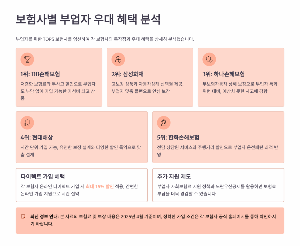 2025년 현재 주요 보험사들이 부업자를 위한 특별 혜택을 경쟁적으로 내놓고 있어요. 제가 직접 5대 보험사의 부업자 전용 상품을 비교 분석한 결과, 각 보험사마다 특화된 장점이 있더라고요. 삼성화재는 온라인 가입 시 20% 할인에 부업 소득 증빙 간소화 서비스를 제공하고 있어요.
