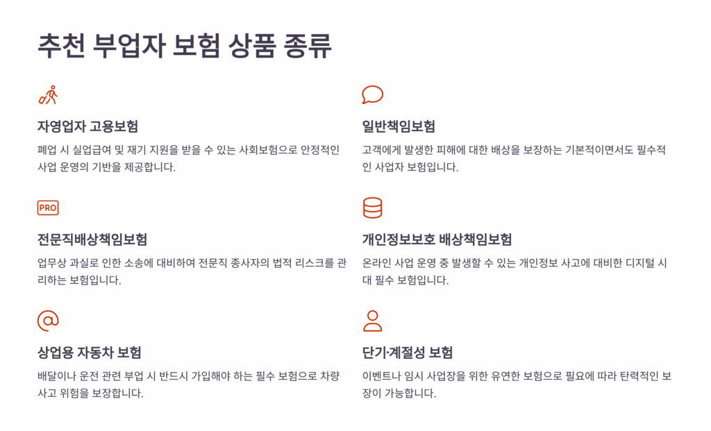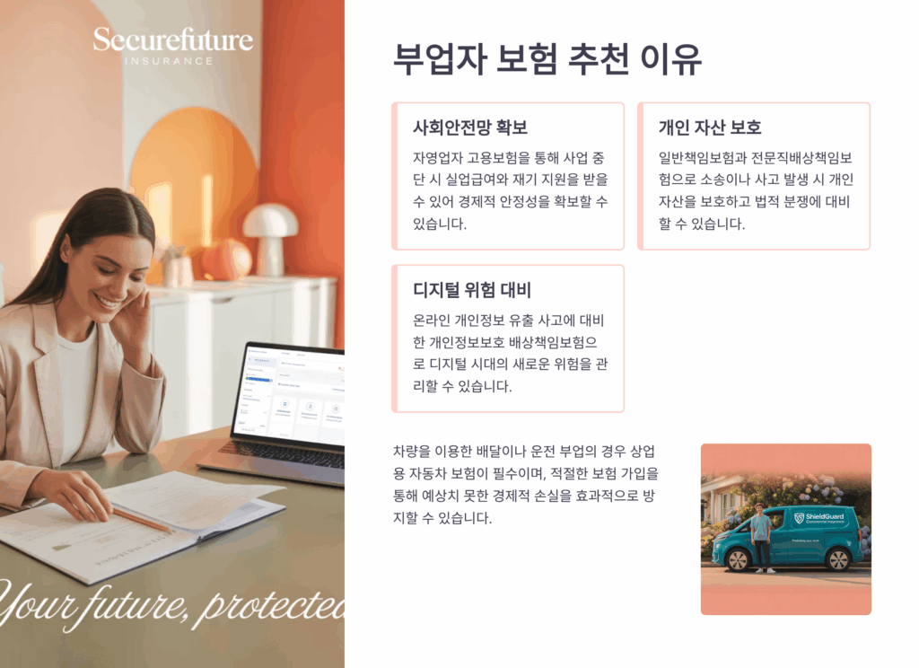 부업의 종류에 따라 필요한 보험이 달라지는데요. 배달업은 상해보험이 필수이고, 온라인 쇼핑몰 운영자는 배상책임보험이 중요해요. IT 프리랜서는 직업성 질병 보장이 포함된 건강보험을 우선 고려해야 하고요. 나의 생각으로는 부업 특성을 정확히 파악한 후 보험을 선택하는 게 가장 현명한 방법이에요.
