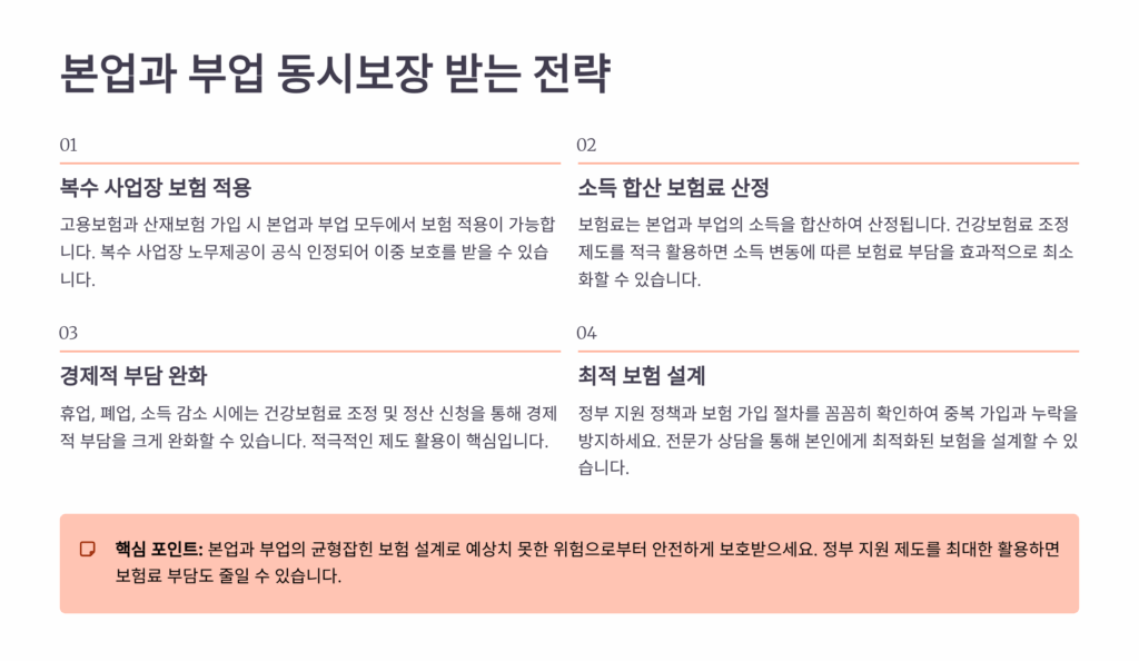 본업과 부업을 동시에 보장받으려면 통합형 보험 설계가 필요해요. 먼저 본업 기준으로 기본 보장을 설정하고, 부업 관련 위험은 특약으로 추가하는 방식이 가장 효율적이에요. 이렇게 하면 중복 보장을 피하면서도 보험료를 절약할 수 있답니다.