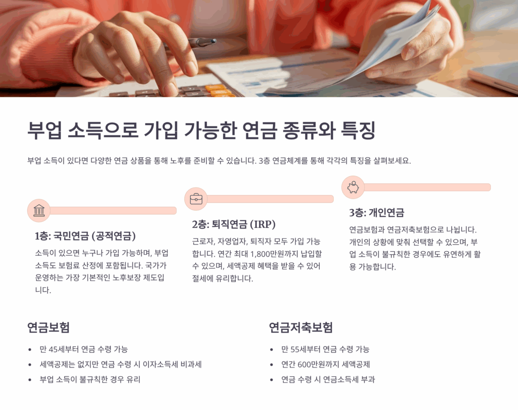 부업자가 가입할 수 있는 연금 상품은 생각보다 다양해요. 근로소득이든 사업소득이든 상관없이 가입 가능한 상품들이 많이 있답니다. 특히 2025년부터는 부업자를 위한 특화 상품도 출시되고 있어요. 각 연금 상품마다 특징이 다르니 자신의 부업 형태와 소득 수준에 맞춰 선택하는 게 중요해요.