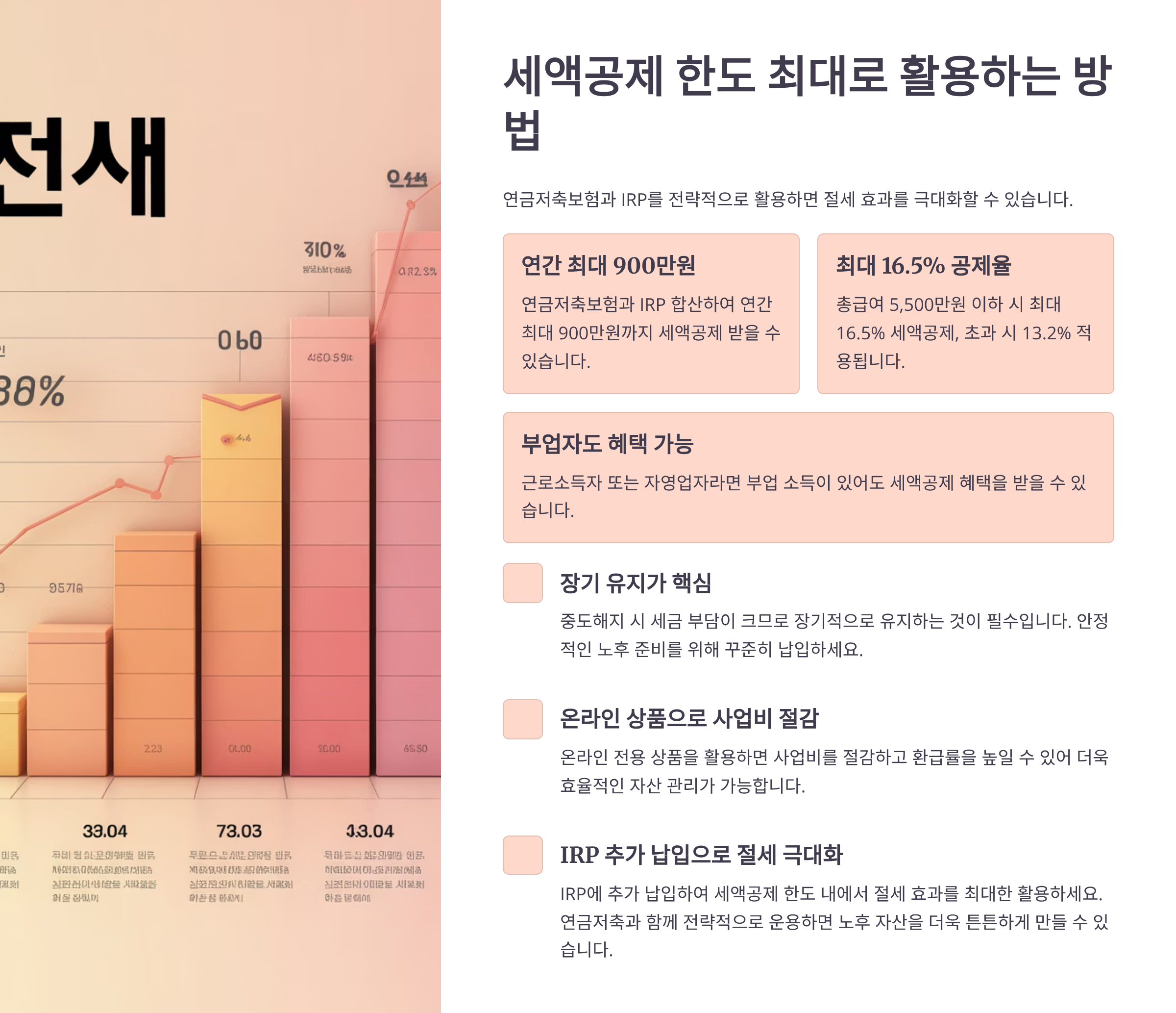 IRP(개인형퇴직연금)는 부업자도 가입 가능한 강력한 절세 상품이에요. 연간 1,800만원까지 납입 가능하고, 세액공제 한도가 900만원으로 가장 높답니다. 2025년부터는 자영업자와 프리랜서도 가입 조건이 완화되어 더 많은 부업자들이 혜택을 받을 수 있게 되었어요.