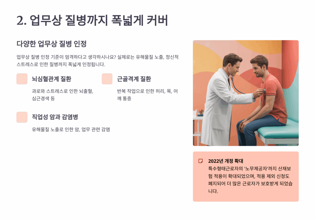 과로성 질병도 중요한 보장 범위예요. 뇌출혈, 심근경색 같은 뇌심혈관계 질환이 대표적이죠. 발병 전 12주간 평균 근무시간이 주 52시간을 초과했거나, 발병 전 1주일간 업무시간이 30% 이상 증가했다면 산재로 인정받을 수 있어요.