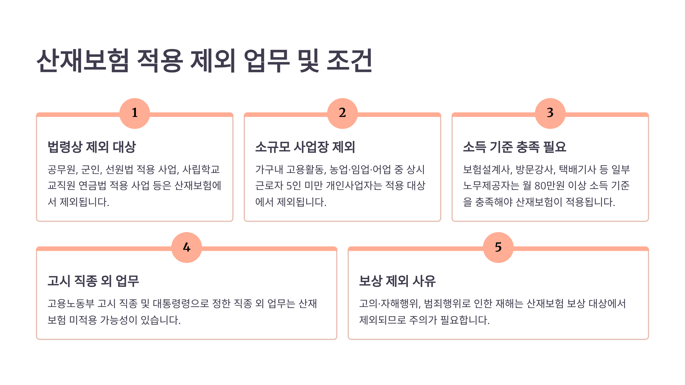 산재보험이 만능은 아니에요. 적용 제외되는 업무들이 있어서 주의해야 해요. 가장 대표적인 게 ‘통상적인 경로 이탈’ 사고예요. 예를 들어 배달 중 개인 볼일을 보러 갔다가 사고가 나면 보상받기 어려워요.