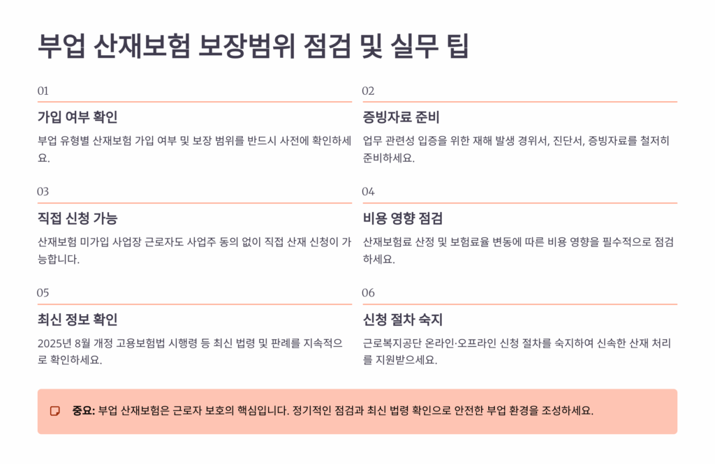 특히 배달, 대리운전, 프리랜서, 온라인 부업 등 다양한 부업 형태별로 보장범위가 달라지는데요. 2025년 개정된 산재보험법에 따라 보장범위가 확대된 부분과 여전히 사각지대에 있는 부분을 명확히 알아야 해요. 실제 보상 사례와 함께 꼼꼼히 설명드릴게요.