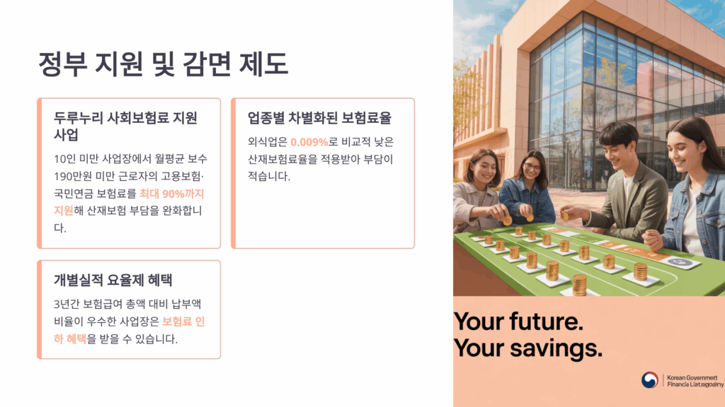 소규모 사업장(10인 미만)은 두루누리 사회보험 지원으로 보험료의 80%까지 지원받을 수 있습니다.