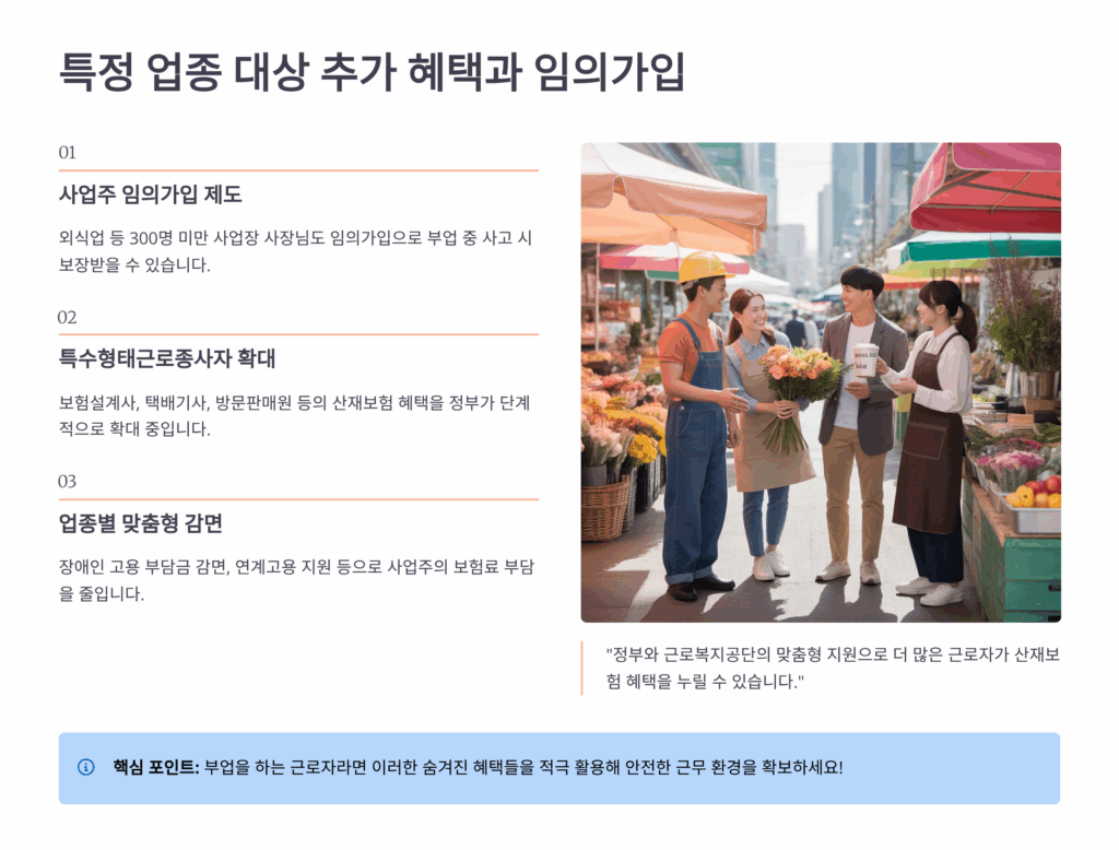 업종별로 받을 수 있는 특별 혜택들이 있다는 걸 아시나요? 예를 들어 건설업 종사자들은 ‘건설근로자 퇴직공제’ 제도와 연계해서 추가 혜택을 받을 수 있어요. 건설 일용직으로 일하면서 부업을 하는 경우, 퇴직공제 가입 기간에 따라 산재보험료를 추가로 감면받을 수 있답니다. 실제로 건설 현장에서 일하는 분들 중에는 이 제도로 보험료의 30-40%를 추가로 절감한 사례가 많아요.