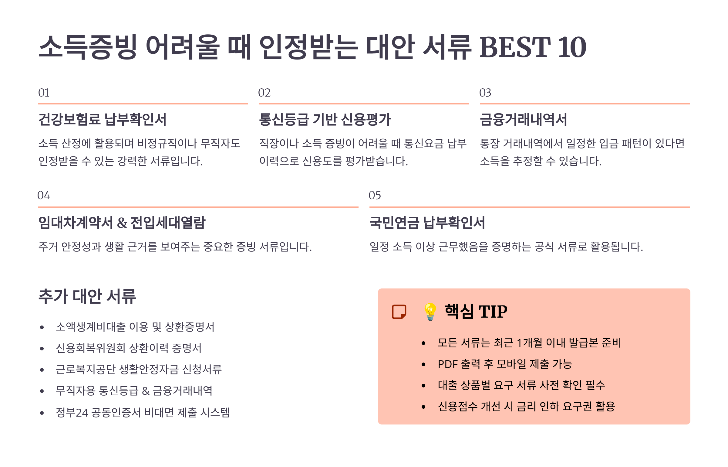 국민연금 가입자 가입증명서도 좋은 대안이 될 수 있어요. 국민연금공단 홈페이지에서 발급 가능하고, 직장가입자나 지역가입자 모두 활용할 수 있어요. 특히 납부 이력이 꾸준하다면 신용도 평가에도 도움이 됩니다.