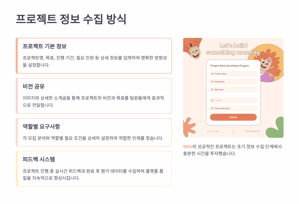 프로젝트 정보를 효과적으로 구성하는 것이 적합한 인재를 찾는 첫걸음이에요. 명확하고 구체적인 프로젝트 설명은 지원자들이 자신의 적합성을 판단하는 기준이 되고, 불필요한 미스매칭을 줄여줘요. 프로젝트 범위, 기간, 예산, 필요 기술을 명확히 명시하는 것이 중요하답니다.
