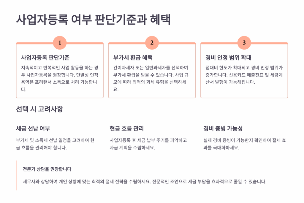 나의 경험으로는 월 평균 수입이 300만원을 넘어서면 사업자등록을 하는 게 유리했어요. 부가세 환급과 경비 인정 범위 확대로 연간 200만원 이상 절세 효과를 봤답니다. 특히 장비나 소프트웨어 구입이 많은 IT 프리랜서라면 사업자등록이 필수라고 생각해요.