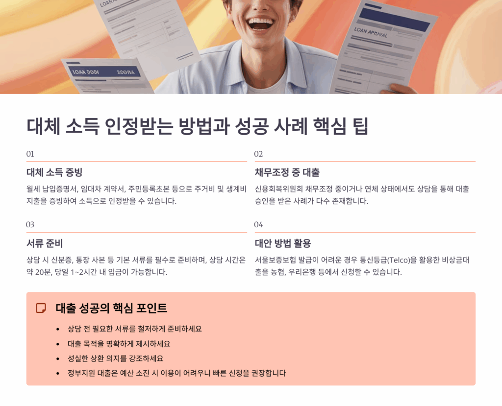 임대 소득이나 이자, 배당 소득도 훌륭한 대체 소득이 돼요. 월세를 받고 있다면 임대차계약서와 월세 입금 내역을, 주식 배당금을 받는다면 증권사 거래 내역을 제출하면 돼요. 특히 임대 소득은 안정적인 수입으로 평가받아 대출 한도가 높아지는 경향이 있어요. 월 30만원의 임대 소득만으로도 500만원 대출을 받은 케이스도 있답니다.