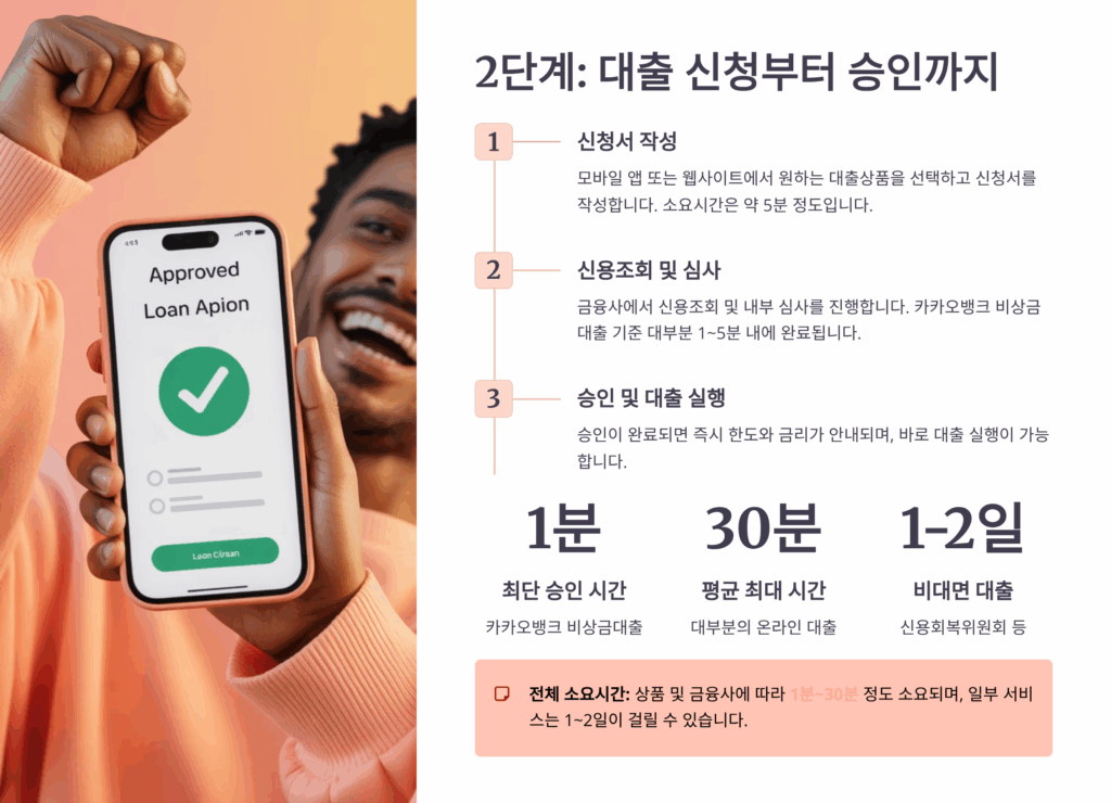 본인인증부터 최종 승인까지 걸리는 시간은 금융사와 상품에 따라 천차만별이에요. 인터넷전문은행은 평균 30분, 저축은행은 1~2시간, 캐피탈은 2~4시간 정도 걸린답니다. 하지만 이건 어디까지나 평균이고, 개인 신용도와 제출 서류에 따라 달라져요.