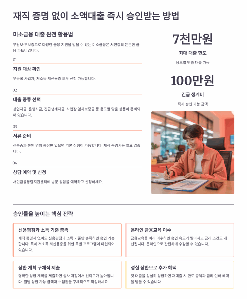 정부 지원 상품도 활용해보세요. 햇살론, 새희망홀씨 같은 서민금융상품은 재직증명서 대신 다른 서류로 대체 가능해요. 연소득 3,500만원 이하, 신용점수 하위 20% 이하면 신청 가능해요. 금리도 연 10% 이하로 낮은 편이에요.