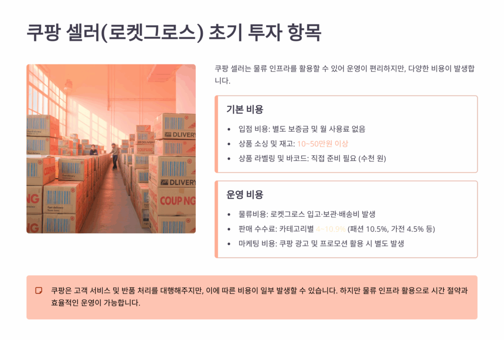 쿠팡 셀러로 시작할 때 가장 큰 부담은 로켓배송을 위한 초기 재고 투자예요. 로켓배송 상품은 최소 30-50개 이상의 재고를 쿠팡 물류센터에 입고해야 하는데, 상품 단가에 따라 초기 투자금이 크게 달라져요. 단가 1만원 상품 기준으로 5개 SKU를 운영한다면 최소 150-250만원의 재고 투자가 필요해요.