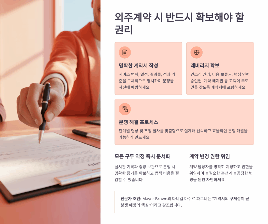 외주계약을 체결할 때 가장 중요한 건 계약서에 명시된 권리들을 확실하게 확보하는 거예요. 많은 분들이 계약서를 대충 읽고 서명하시는데, 이게 나중에 큰 문제가 되더라구요. 제가 경험한 바로는 계약서 한 줄 한 줄이 정말 중요해요. 특히 업무 범위, 대금 지급 조건, 지적재산권 귀속 문제는 반드시 명확하게 해야 해요.