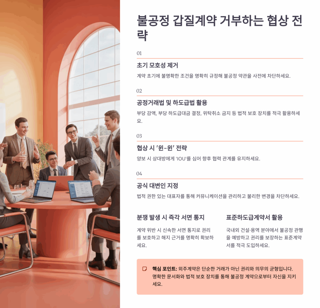 셋째, 법적 근거를 활용하세요. 하도급법이나 공정거래법 조항을 인용하면서 “이 조항은 하도급법 제3조에 위배되는 부당한 특약입니다”라고 지적하면, 대부분의 기업들은 수정에 응해요. 법적 분쟁을 원하는 기업은 없거든요.
