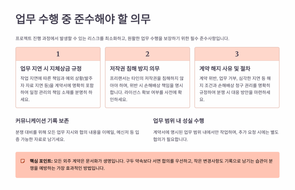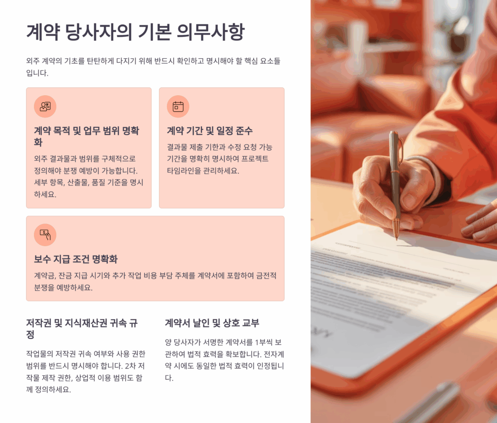 외주계약은 단순히 업무를 맡기고 받는 관계를 넘어서 법적 책임과 의무가 따르는 중요한 거래예요. 프리랜서든 기업이든 외주계약을 체결하면 반드시 지켜야 할 의무사항들이 생기죠.