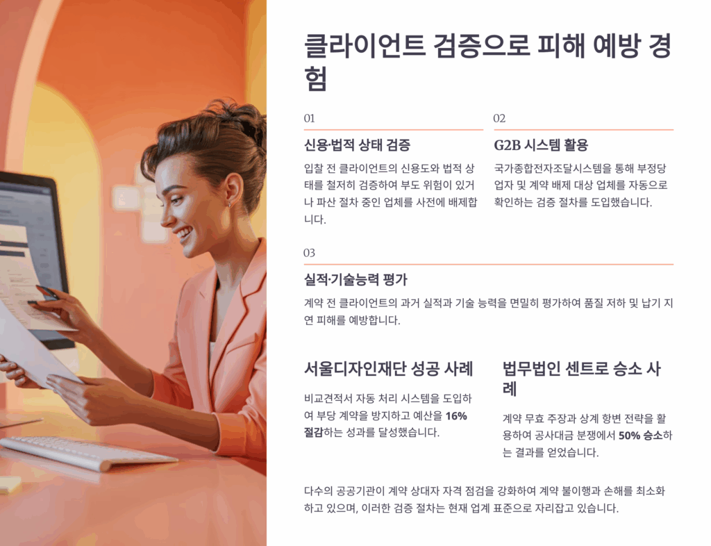 클라이언트 검증 체크리스트를 만들어두면 도움이 돼요. 사업자등록 상태, 설립일, 자본금, 대표자 정보, 주소지 확인, 과거 분쟁 이력, 온라인 평판 등을 체계적으로 확인하는 거죠. 이 과정에 30분만 투자해도 수개월의 고생을 막을 수 있어요.