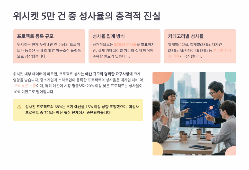 위시켓은 국내 최대 IT 아웃소싱 플랫폼으로, 2012년 설립 이후 누적 프로젝트 등록 건수가 5만 건을 넘어섰어요. 하지만 실제 성사율은 많은 분들이 예상하는 것과는 다른 현실을 보여주고 있답니다.