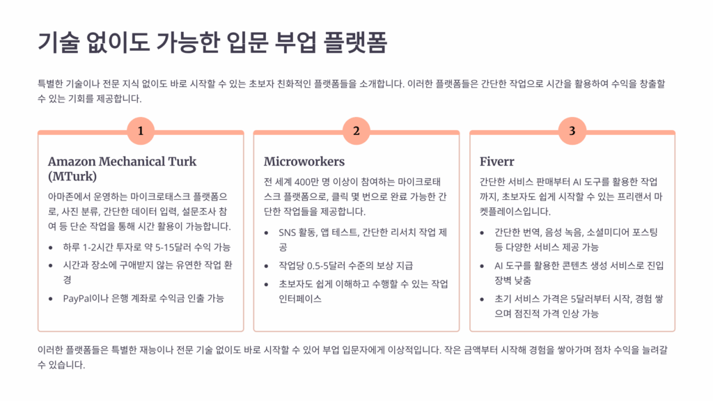 초보자가 시작하기 좋은 플랫폼들을 카테고리별로 정리했어요. 각 플랫폼의 특징과 예상 수익, 난이도를 비교해서 자신에게 맞는 것을 선택하면 돼요. 대부분 무료로 가입할 수 있고 바로 시작 가능해요.