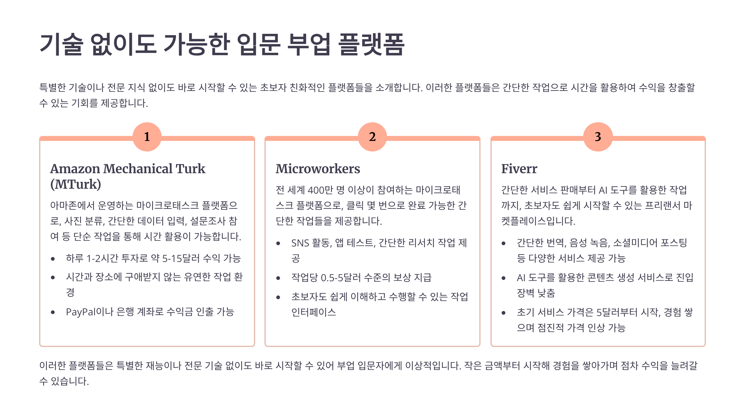 | 플랫폼 | 작업 유형 | 시간당 수익 | 결제 주기 |