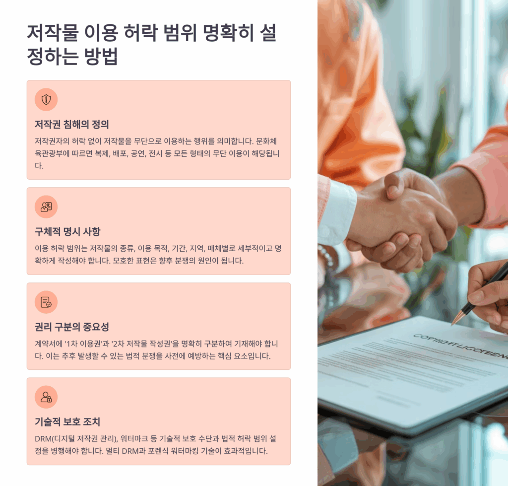 계약서에는 이용허락 범위를 벗어난 사용에 대한 위약 조항도 포함해야 해요. 위반 시 계약 해지, 손해배상 청구 등의 법적 조치를 명시하면 계약 당사자들이 약속을 더 잘 지키게 돼요. 대법원 판례에서도 명확한 위약 조항이 있는 경우 손해배상 산정에 유리하다고 판시한 바 있어요.