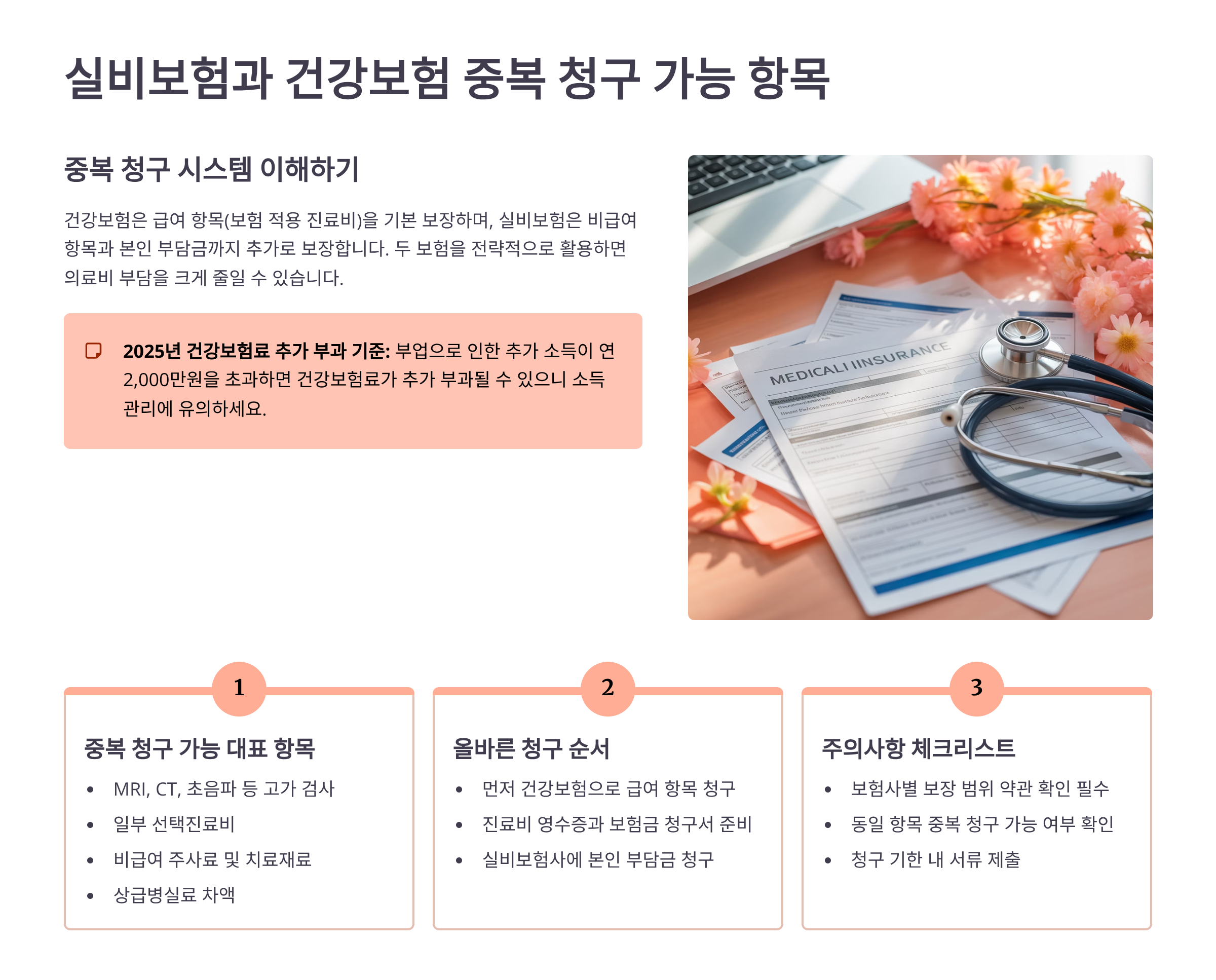 많은 분들이 실비보험 청구하면 건강보험은 못 받는다고 생각하는데, 전혀 아니에요! 실비보험과 건강보험은 별개의 시스템이라 중복 청구가 가능한 항목들이 꽤 많아요. 제가 작년에 허리 디스크로 병원 다니면서 실비랑 건강보험 둘 다 청구해서 거의 200만 원 가까이 돌려받았거든요.