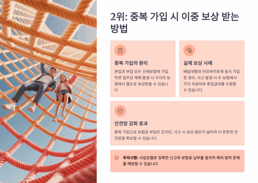중복 보상을 받기 위한 전략적 가입 방법이 있어요. 먼저 기본적으로 근로복지공단 산재보험에 가입하고, 여기에 민간 보험사의 특약형 산재보험을 추가하는 거예요. 그리고 업종별 특화 보험을 하나 더 가입하면 3중 안전망이 완성된답니다.