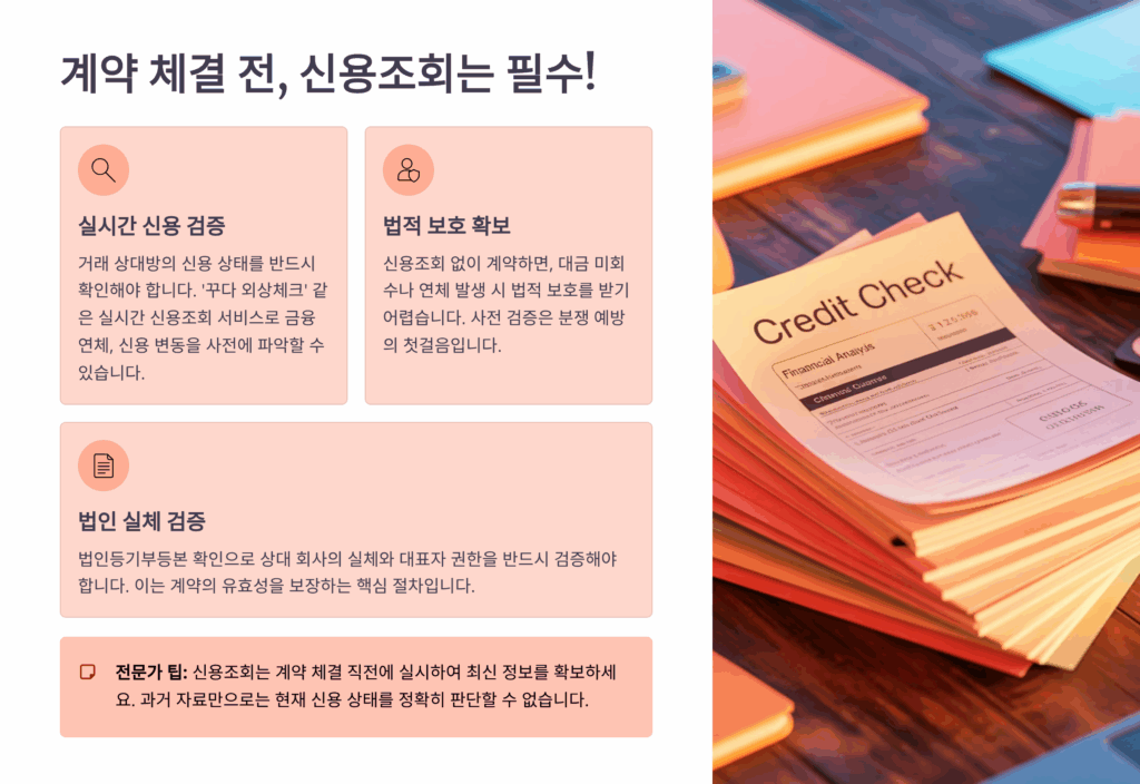 외주업체와 계약하기 전에 신용조회는 선택이 아닌 필수예요. 많은 기업들이 이 과정을 생략하다가 나중에 큰 손실을 입는 경우가 많답니다. 신용조회를 통해 업체의 재무 건전성, 과거 계약 이행 실적, 소송 이력 등을 미리 파악할 수 있어요. 특히 대금 지급 후 잠적하거나 부도가 나는 경우를 예방할 수 있죠.