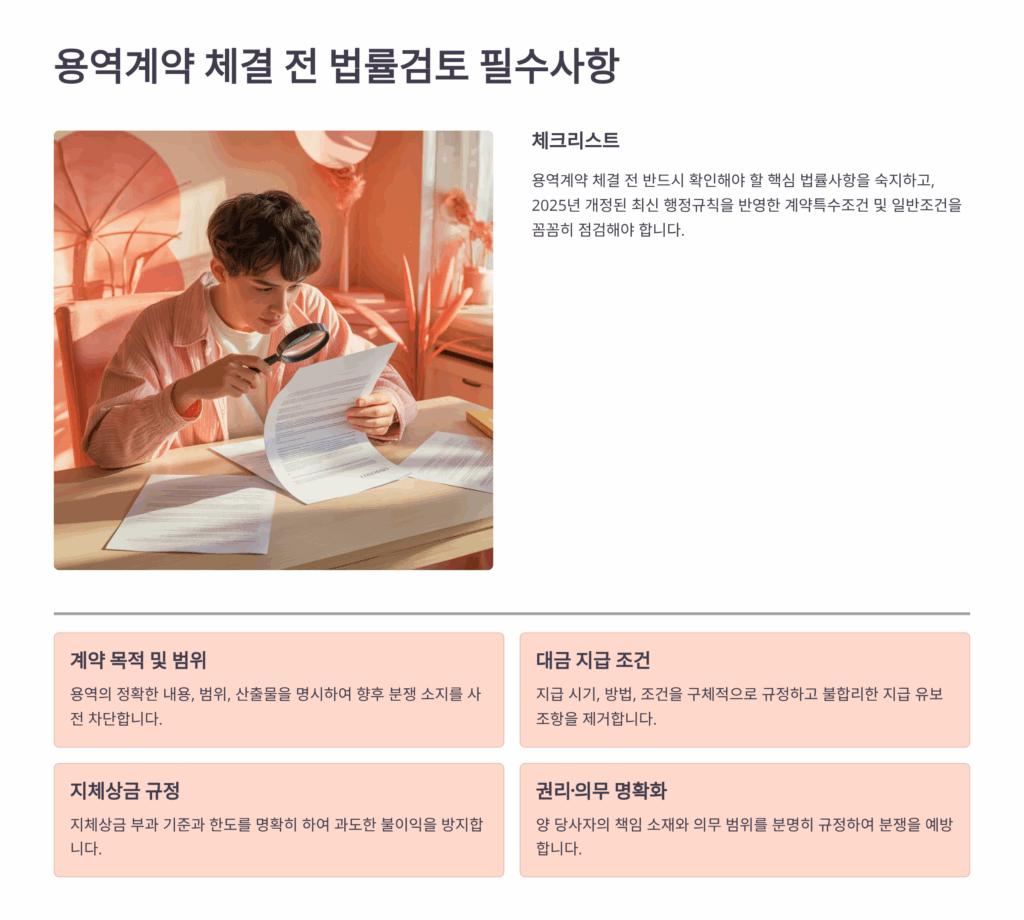 용역계약을 체결하기 전에 반드시 검토해야 할 법률적 사항들이 있어요. 먼저 계약 당사자의 자격과 권한을 확인하는 것이 중요해요. 상대방이 법인인 경우 대표권한이 있는지, 개인사업자인 경우 사업자등록 상태가 정상인지 확인해야 합니다. 실제로 대표권한이 없는 사람과 체결한 계약이 무효가 되어 큰 손해를 본 사례가 많아요.