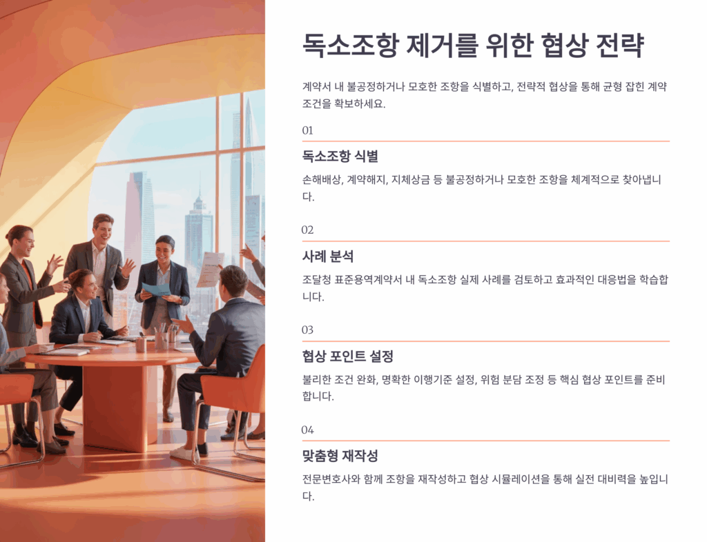단계적 협상 접근법도 추천해요. 모든 독소조항을 한 번에 수정하려 하면 상대방이 거부감을 느낄 수 있어요. 가장 중요하고 위험한 조항부터 우선순위를 정해 단계적으로 협상하세요. 때로는 일부 조항은 양보하면서 핵심 조항을 지키는 전략이 필요할 수도 있어요.
