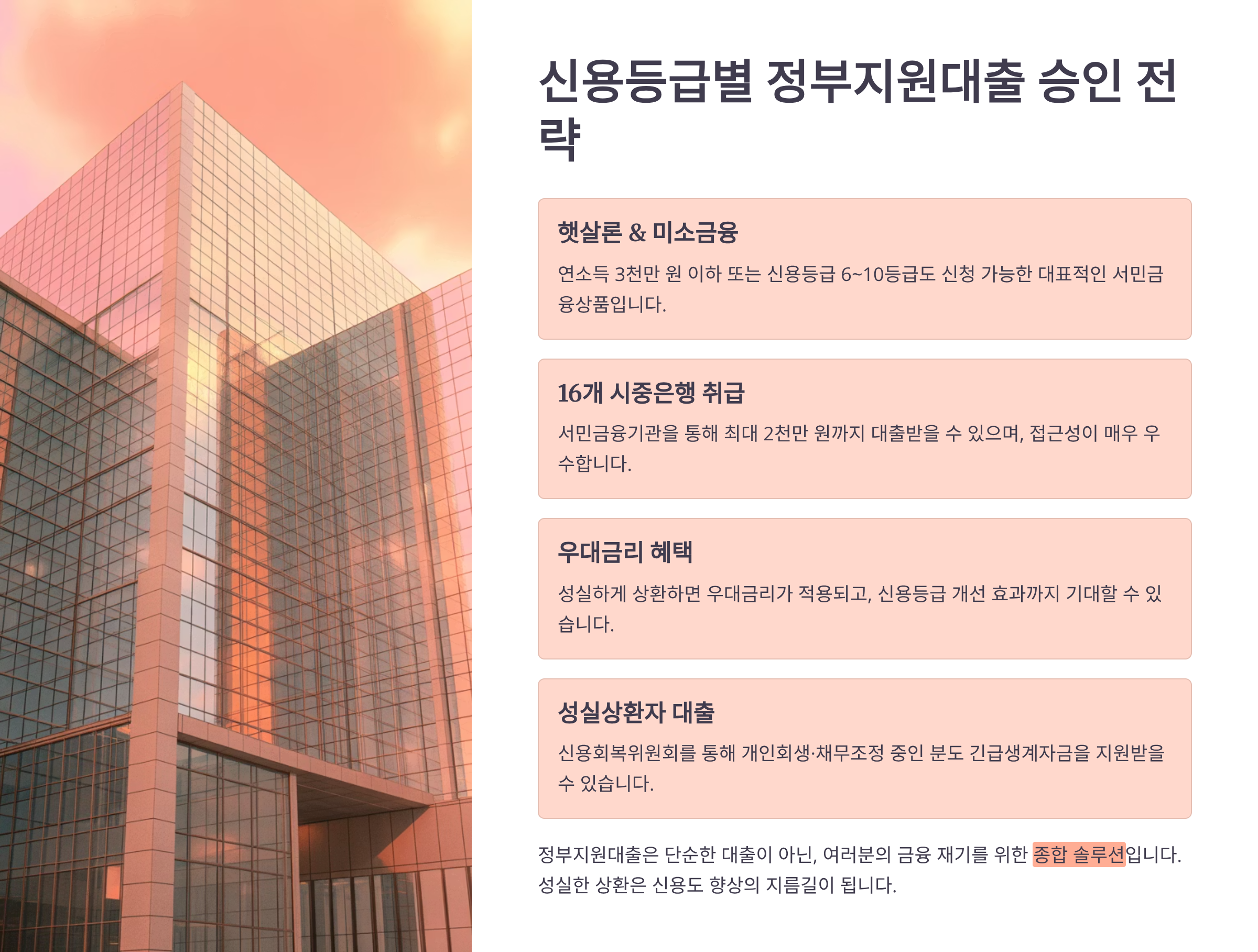 신용등급별로 접근해야 할 정부지원대출이 달라요. 1~3등급은 일반 시중은행 대출도 가능하지만, 정부지원대출을 활용하면 더 낮은 금리로 대출받을 수 있어요. 4~6등급은 새희망홀씨, 바꿔드림론 같은 중금리 대출이 적합하고, 7~10등급은 햇살론, 미소금융 같은 서민금융상품을 활용하는 게 좋아요.