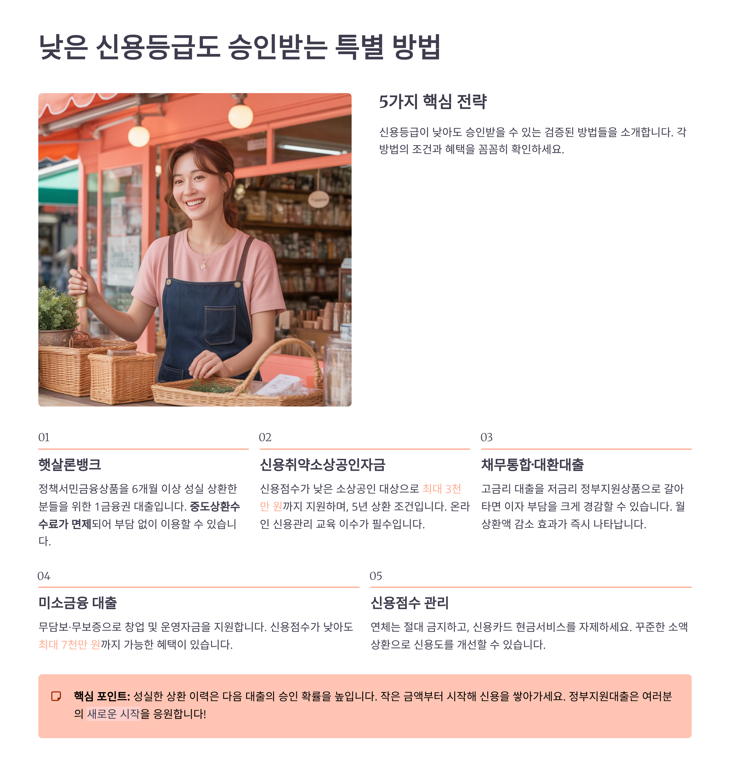 A1. 네, 가능해요. 햇살론17, 미소금융 같은 초저신용자 대상 상품이 있어요. 소득이 있고 상환 의지가 확실하다면 충분히 승인받을 수 있답니다.