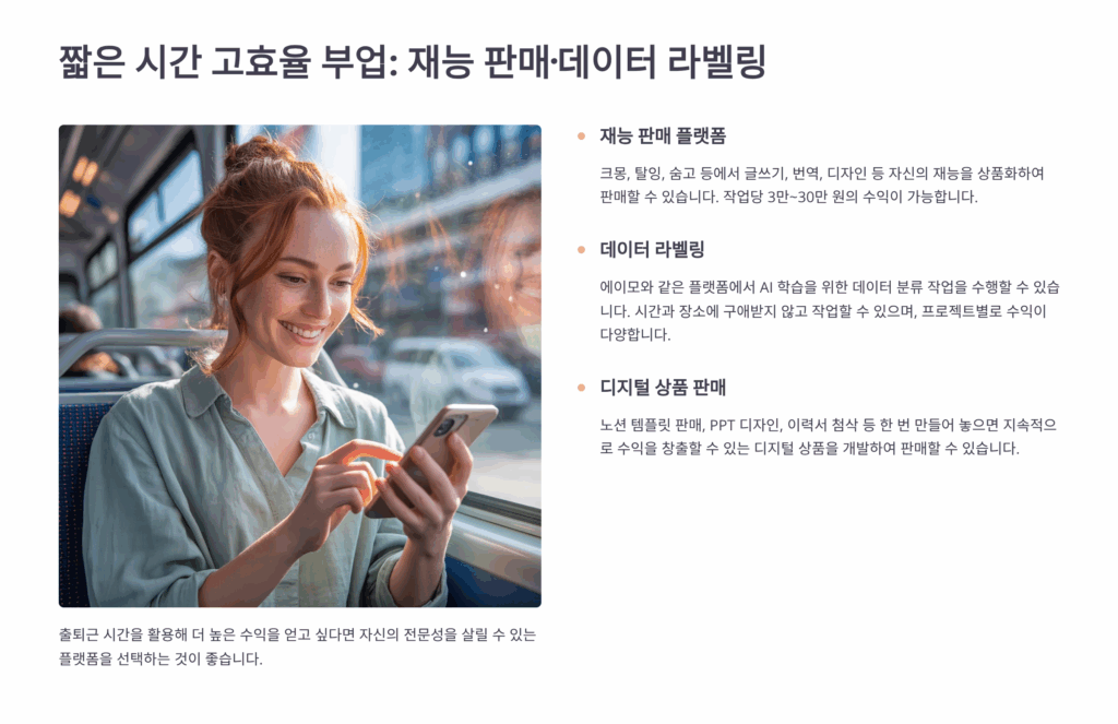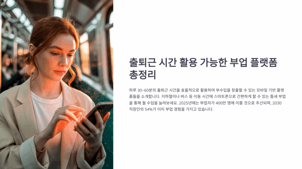 매일 출퇴근하면서 버스나 지하철에서 보내는 시간이 아깝다고 느끼신 적 있으신가요? ???? 하루 평균 2시간이 넘는 출퇴근 시간을 활용해서 부수입을 만들 수 있다면 어떨까요? 실제로 많은 직장인들이 출퇴근 시간을 활용해 월 30만원에서 100만원까지 추가 수익을 올리고 있어요.
