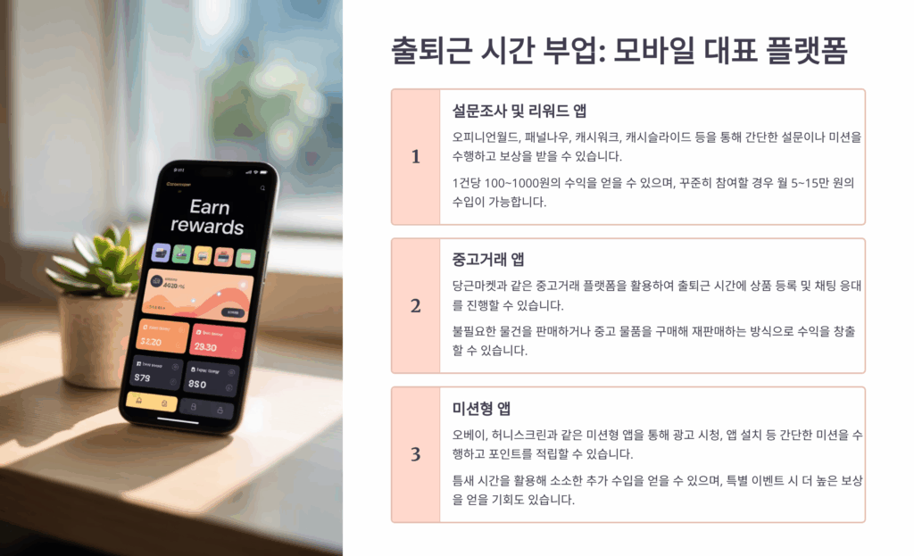이 글에서는 출퇴근 시간에 스마트폰 하나로 할 수 있는 다양한 부업 플랫폼들을 소개해드릴게요. 각 플랫폼의 특징과 예상 수익, 실제 사용자들의 생생한 후기까지 담았으니 여러분에게 맞는 부업을 찾아보세요! ????