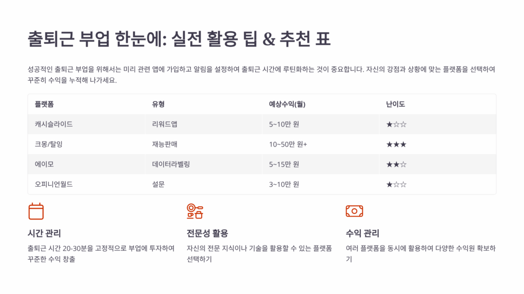 출퇴근 시간은 보통 30분에서 1시간 정도로 제한적이에요. 이 짧은 시간 동안 최대한의 수익을 낼 수 있는 고효율 플랫폼들을 소개해드릴게요. 시간 대비 수익률이 높은 순서로 정리했으니 참고하세요! ⏰