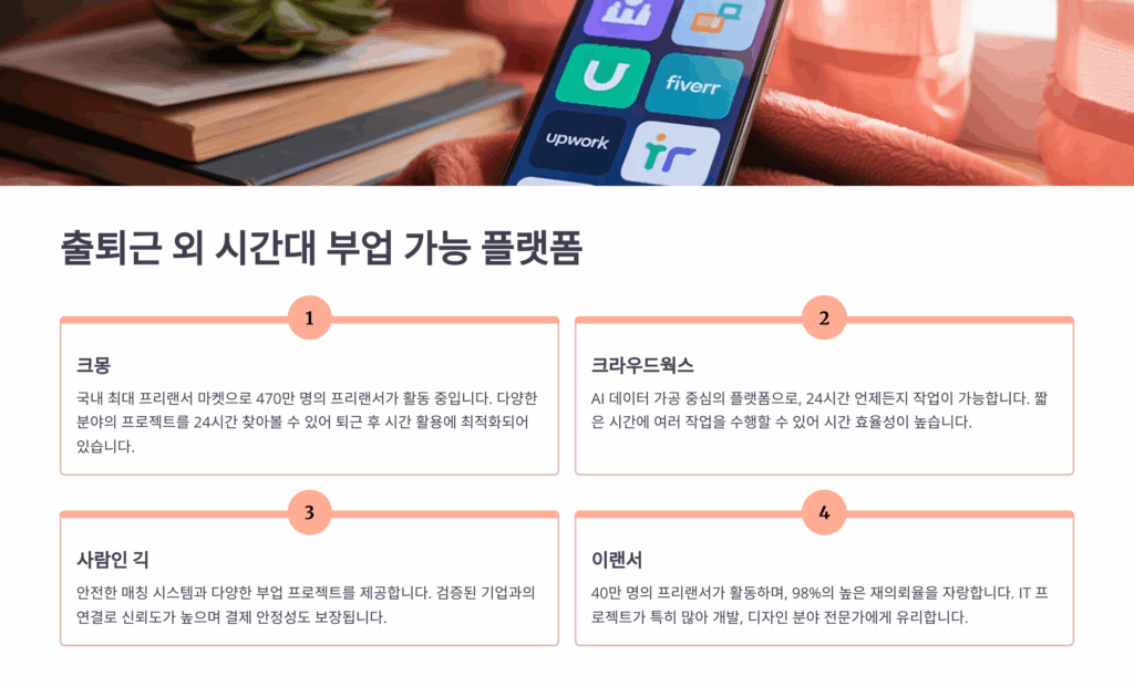 본 콘텐츠는 일반적인 정보 제공을 목적으로 작성되었으며, 개인의 상황에 따라 결과가 다를 수 있습니다. 부업 시작 전 본인의 근로계약서 확인, 세무 상담 등 전문가의 조언을 구하시기 바랍니다. 또한 모든 부업 활동은 관련 법규를 준수하여 진행하시기 바랍니다.